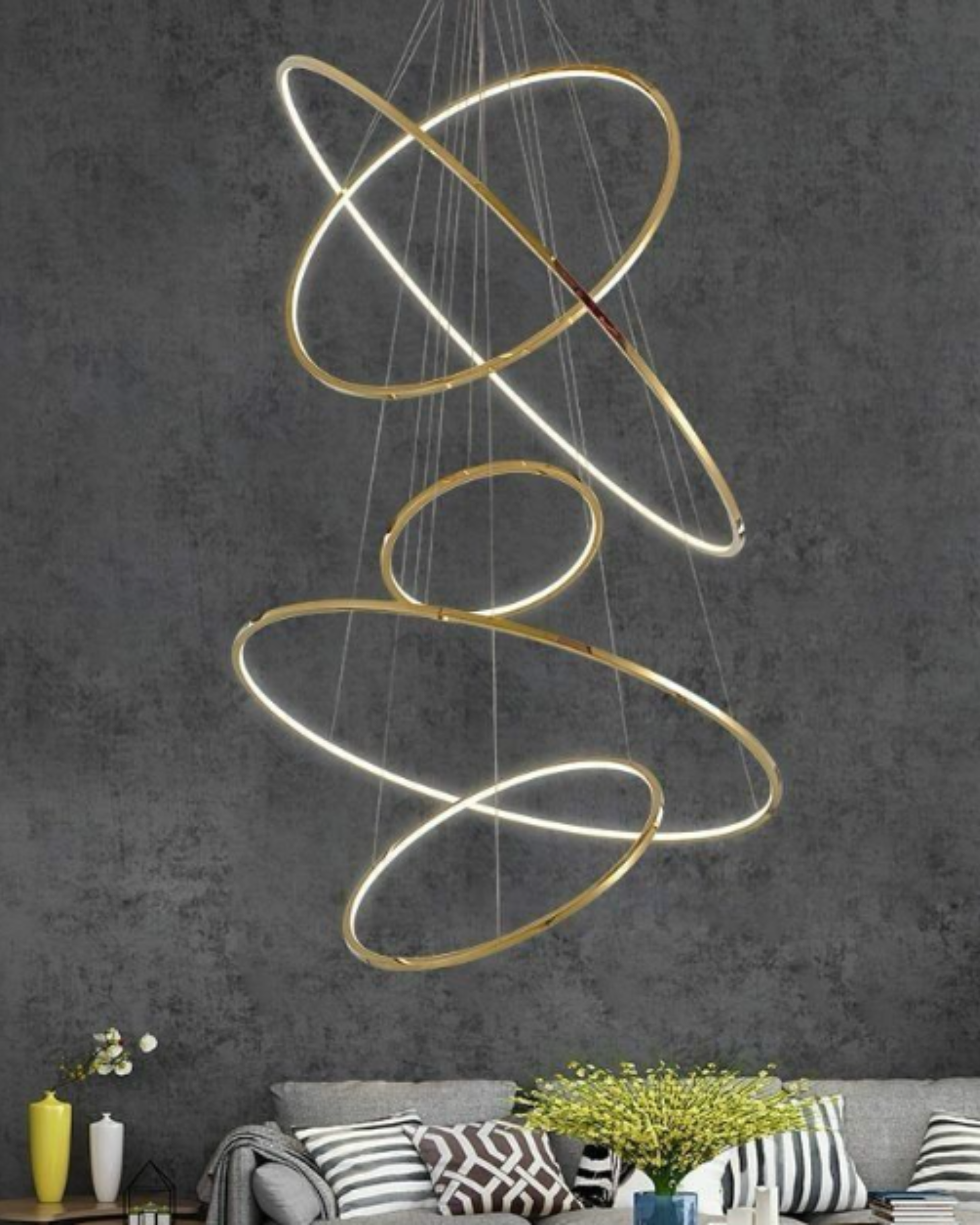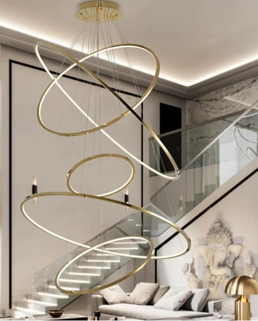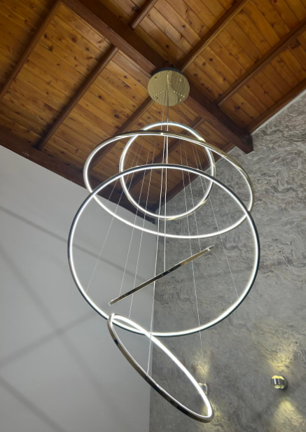 Diseño: Compuesto por varios aros entrelazados suspendidos con cables ajustables, creando un efecto tridimensional.