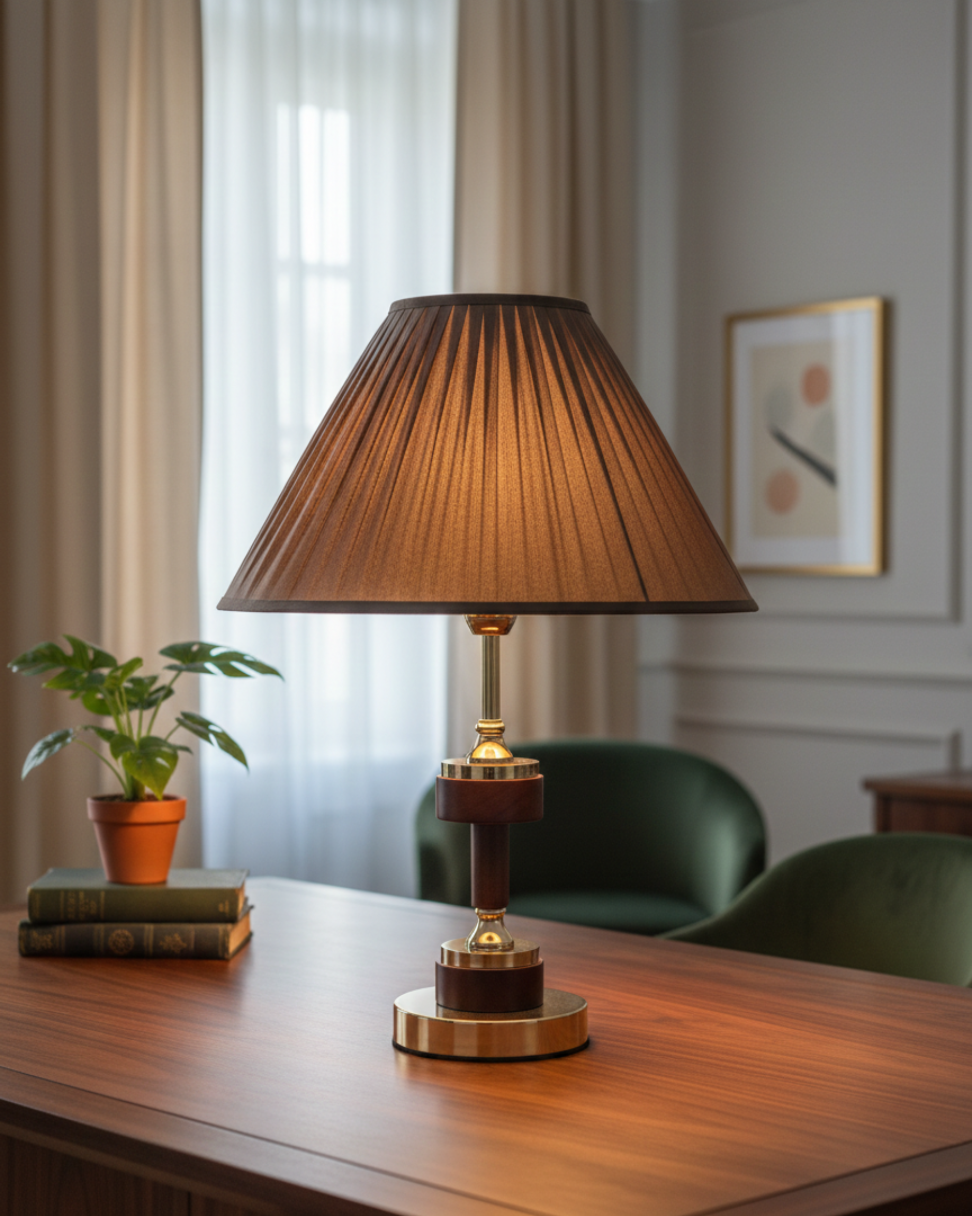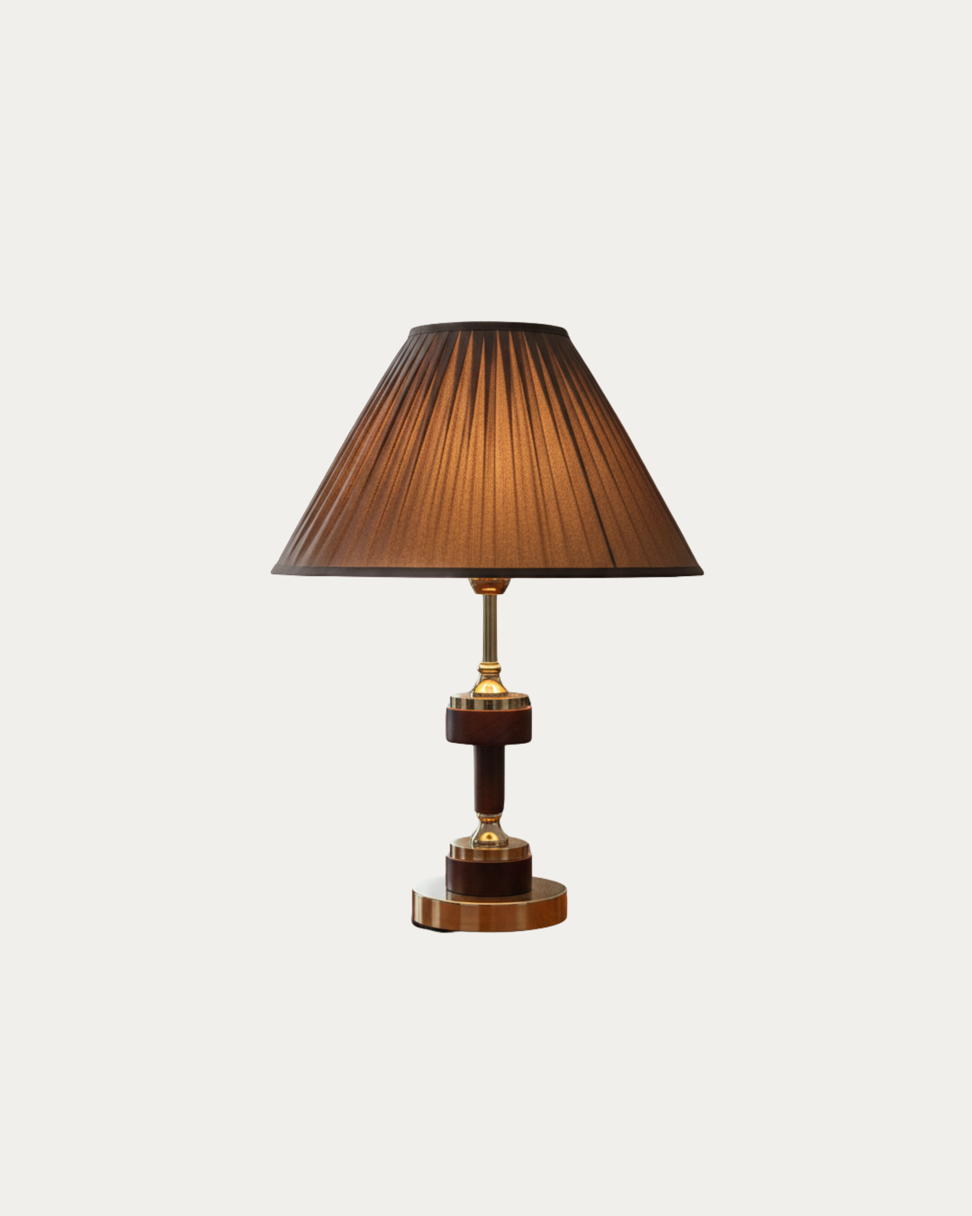 Lámpara de mesa con estructura metálica color café, ideal para crear ambientes cálidos, elegantes y funcionales en espacios residenciales y comerciales.