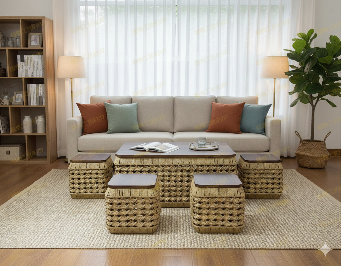 ✔ Set multifuncional: mesa de centro + puffs decorativos