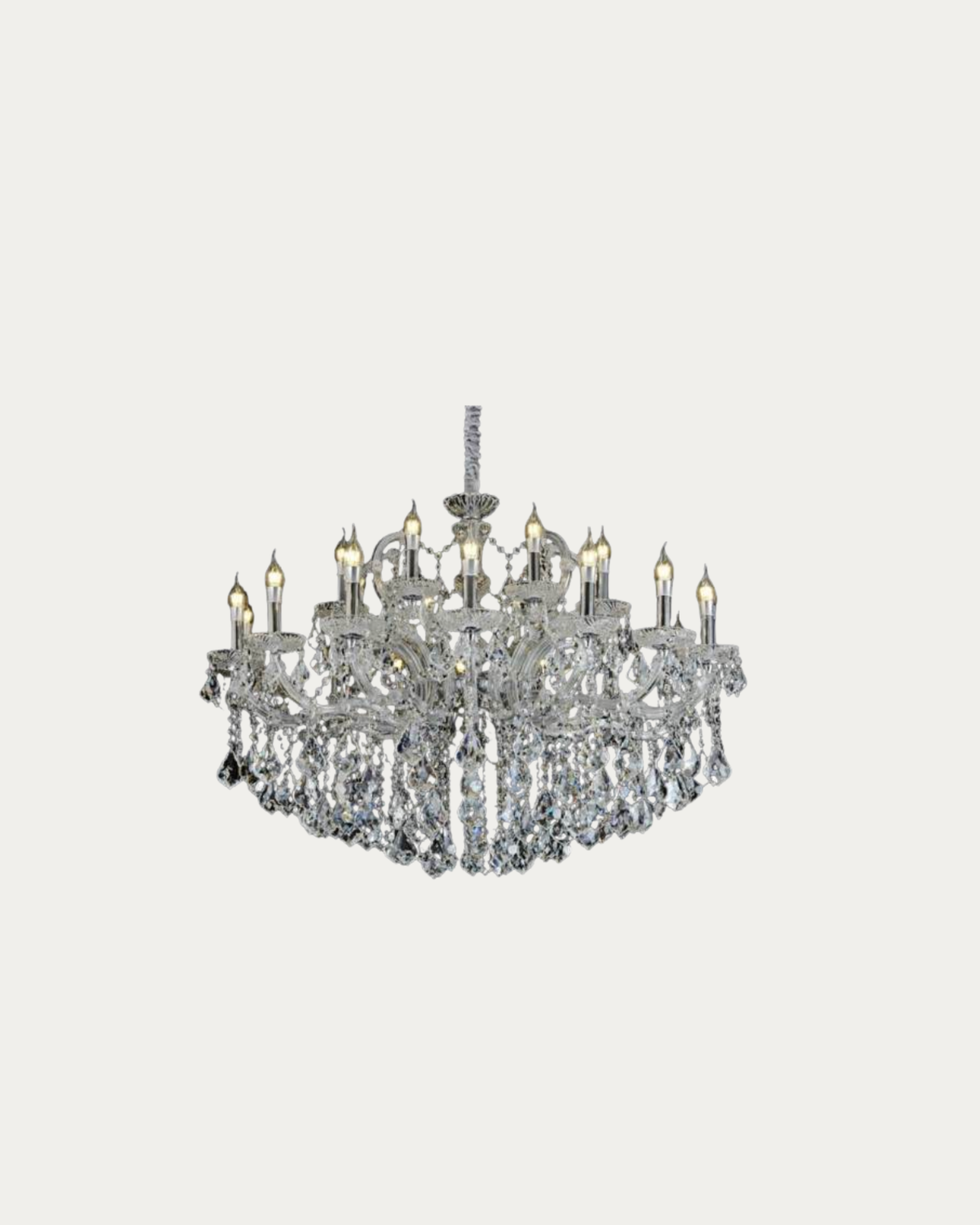 Este chandelier es una pieza decorativa de alto impacto visual. Su diseño en cristal facetado permite un juego de luz brillante y elegante, convirtiéndolo en el centro de atención de cualquier ambiente. Su tamaño lo hace ideal para espacios amplios donde se desea un toque de lujo y modernidad.