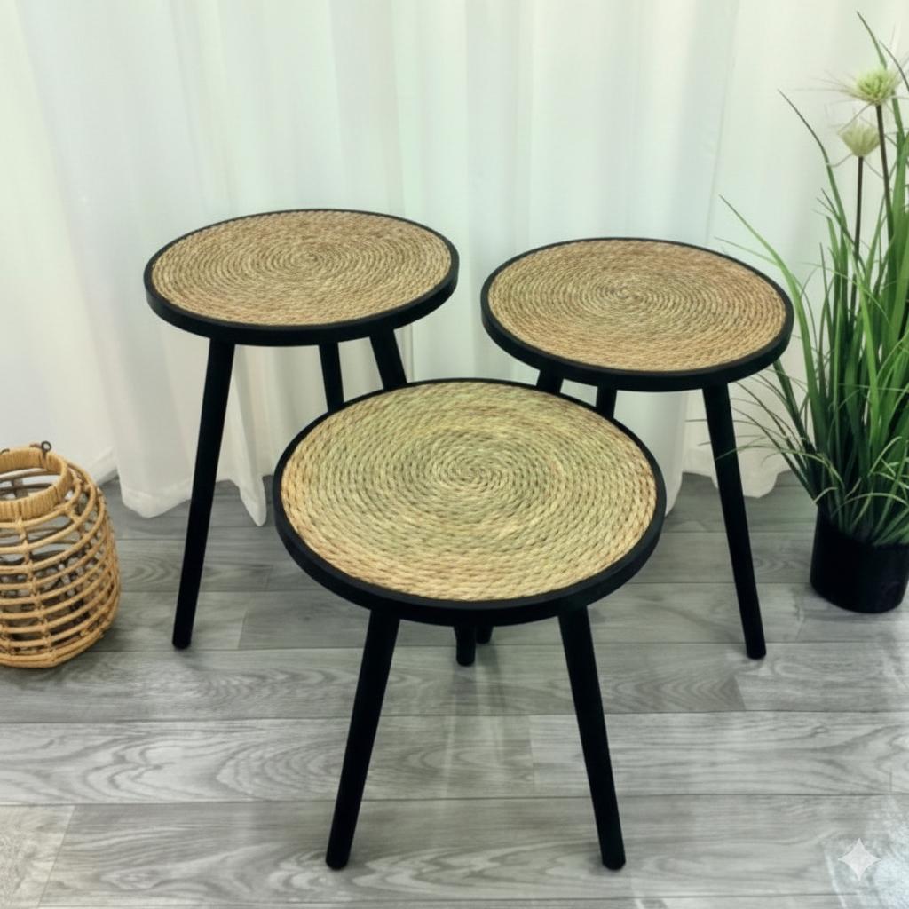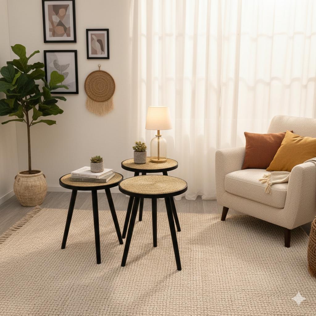 Gracias a sus tres alturas diferentes, las mesas pueden utilizarse juntas como conjunto decorativo o por separado según la necesidad, funcionando perfectamente como mesas de centro, mesas auxiliares o mesas de apoyo. Son ideales para optimizar el espacio sin sobrecargar el ambiente, aportando una sensación visual ligera y elegante.