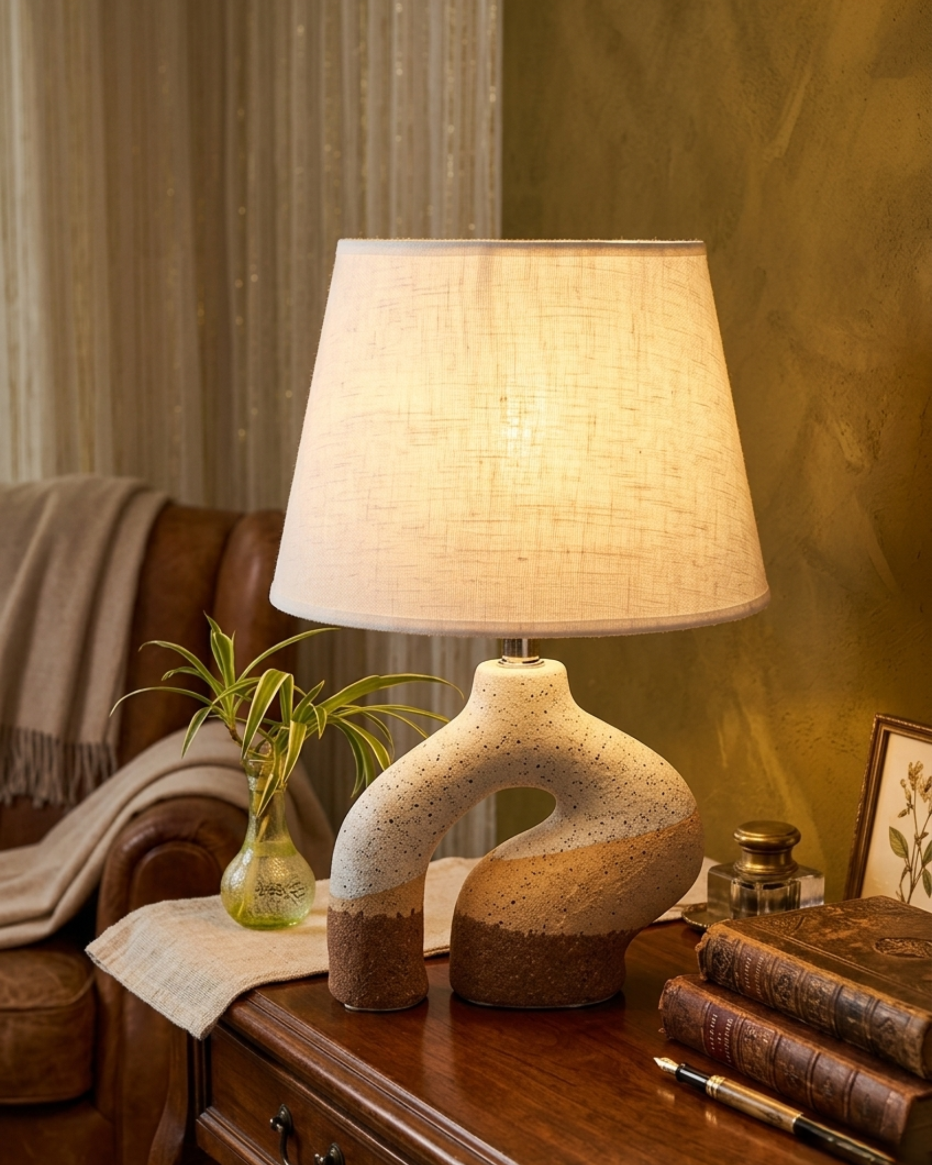 Dale un toque elegante y acogedor a tus espacios con esta hermosa lámpara de mesa con base en cerámica en tonos blanco y café. Su diseño moderno y decorativo la convierte en el complemento perfecto para iluminar y decorar tu hogar u oficina.