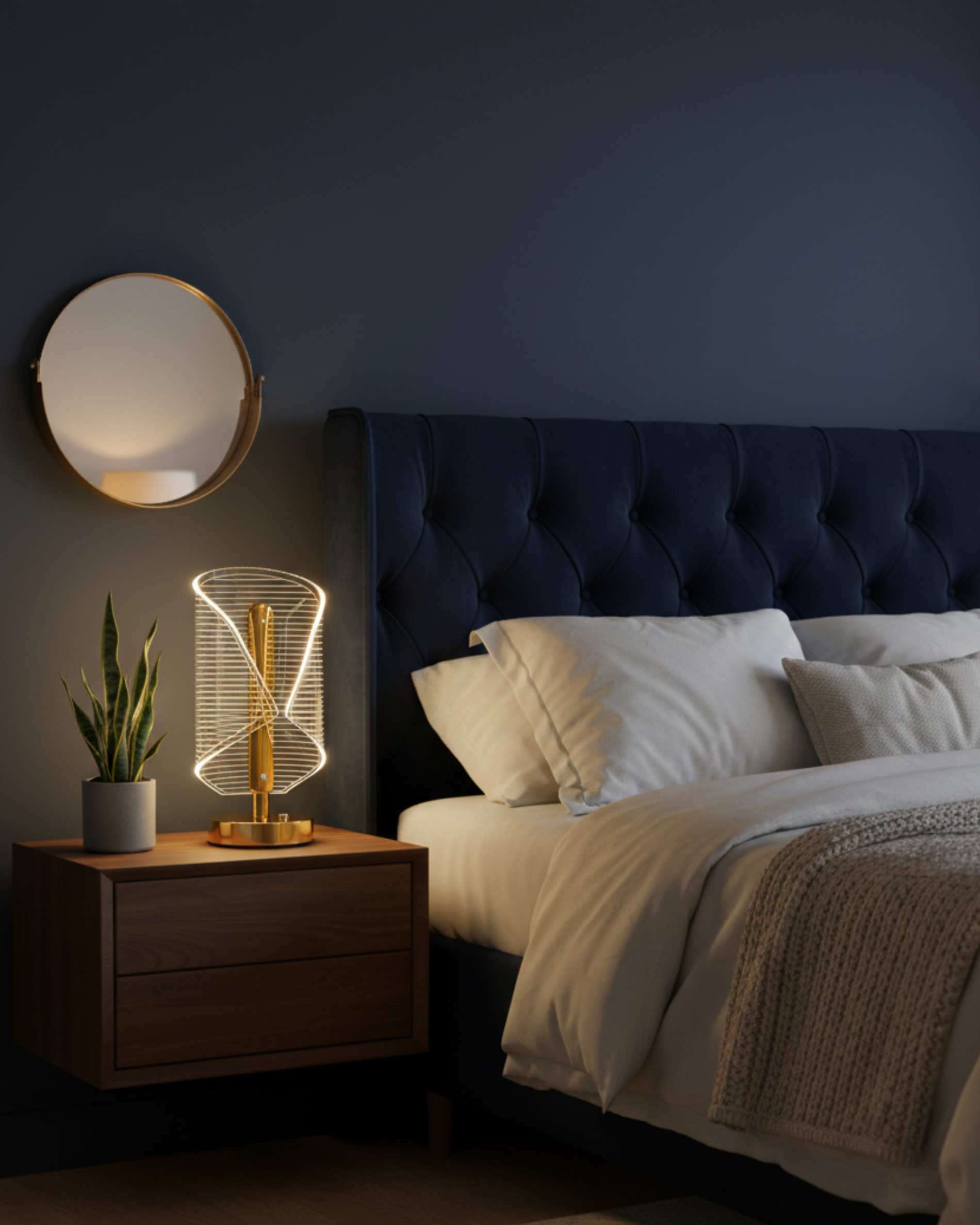 Equipada con sistema Touch, permite encender y controlar la iluminación con un solo toque. Su funcionamiento recargable elimina cables visibles, ofreciendo libertad de ubicación y una estética limpia.