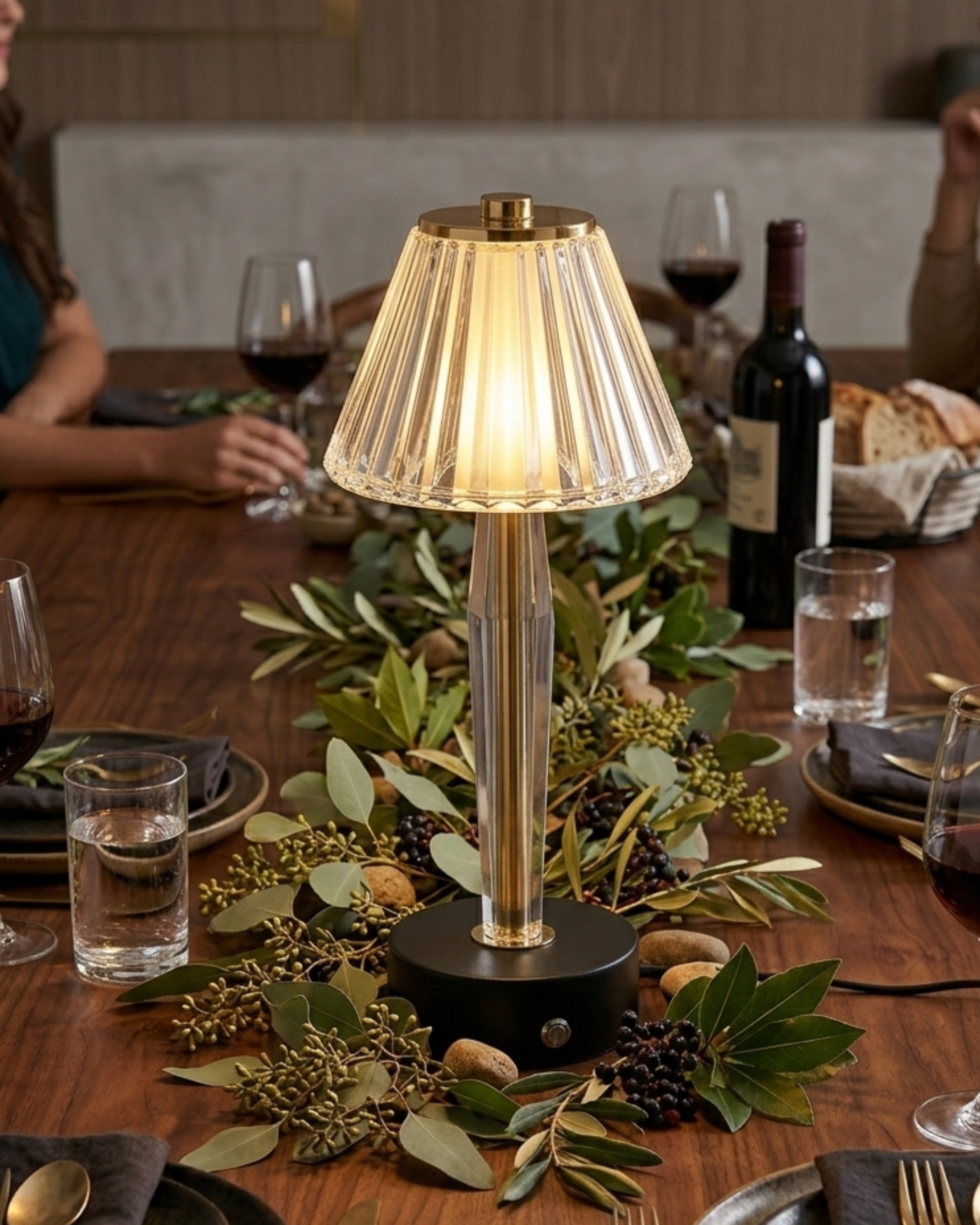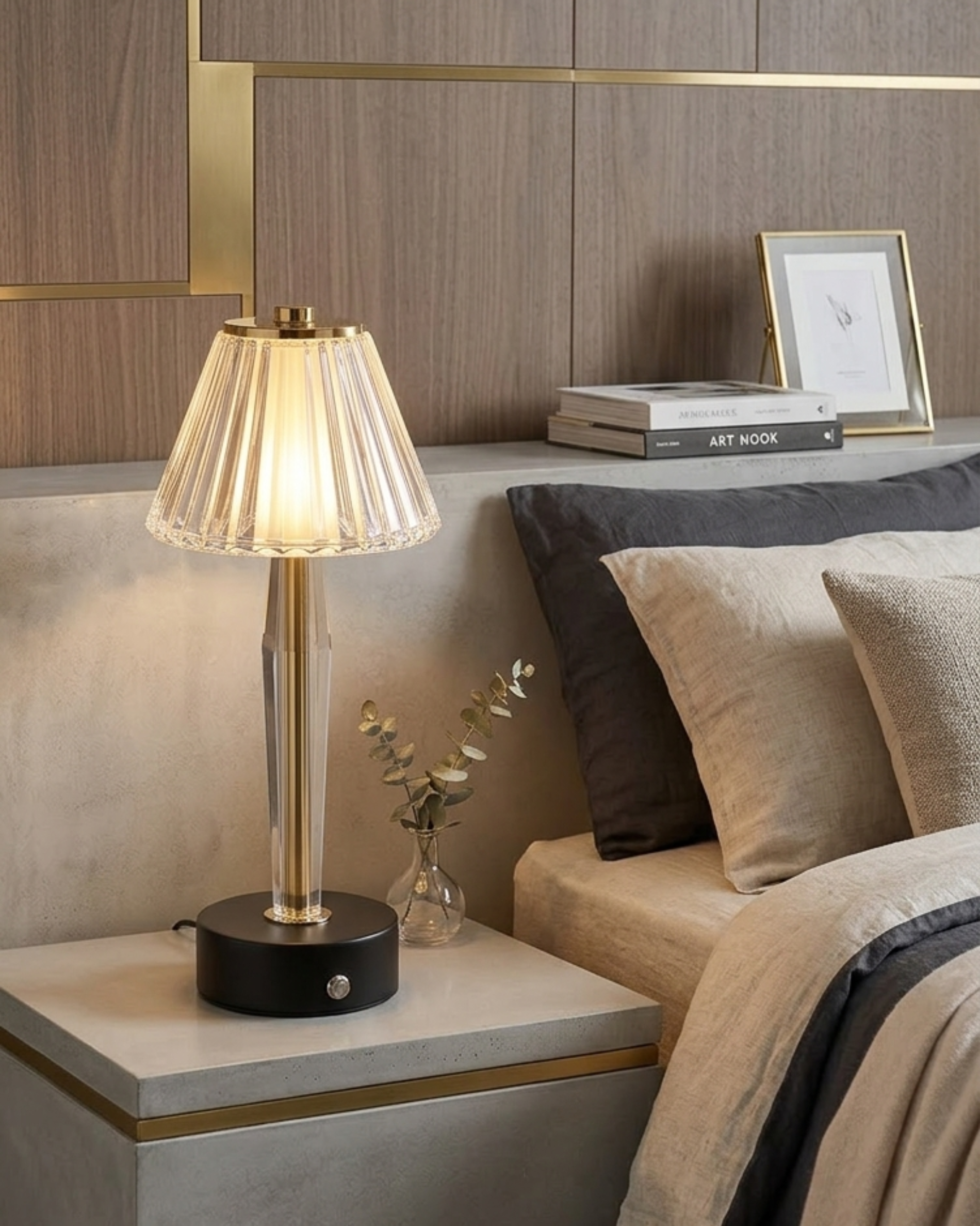 Cuenta con sistema touch, que permite encender y apagar la lámpara fácilmente con un toque, y funciona con batería recargable, eliminando cables visibles y ofreciendo mayor libertad de ubicación. Su iluminación LED de bajo consumo la convierte en una opción eficiente y decorativa para mesas de noche, escritorios, salas y restaurantes.