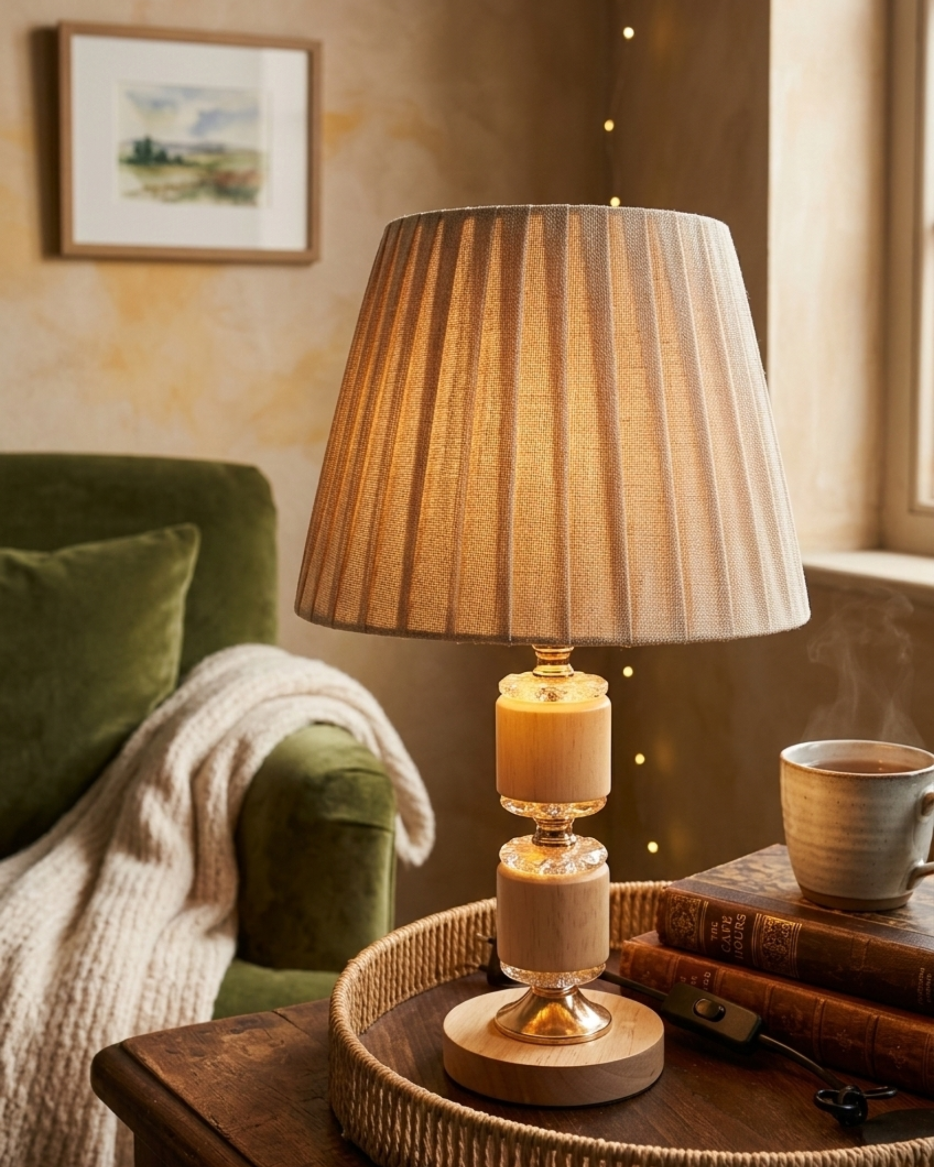 Lámpara de mesa con diseño vintage, estructura decorativa y pantalla verde, ideal para crear ambientes cálidos, elegantes y con carácter.
