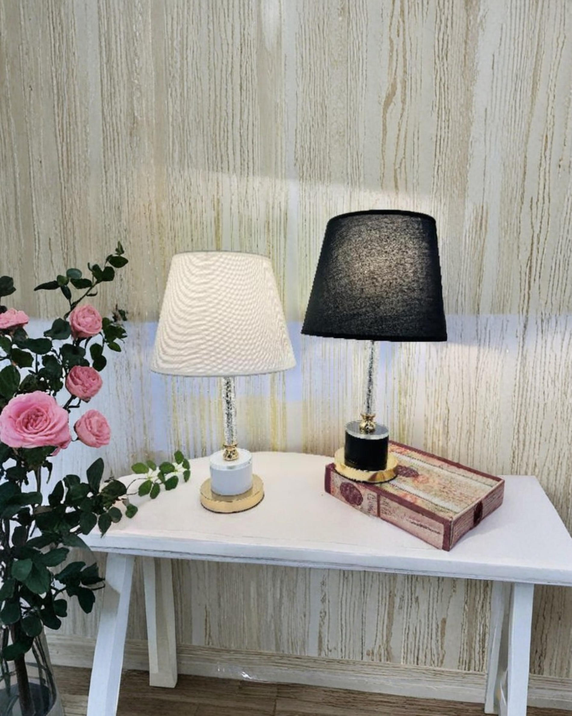 Lámpara de mesa decorativa con estructura metalizada y cuerpo en acrílico, ideal para crear ambientes modernos, elegantes y sofisticados.