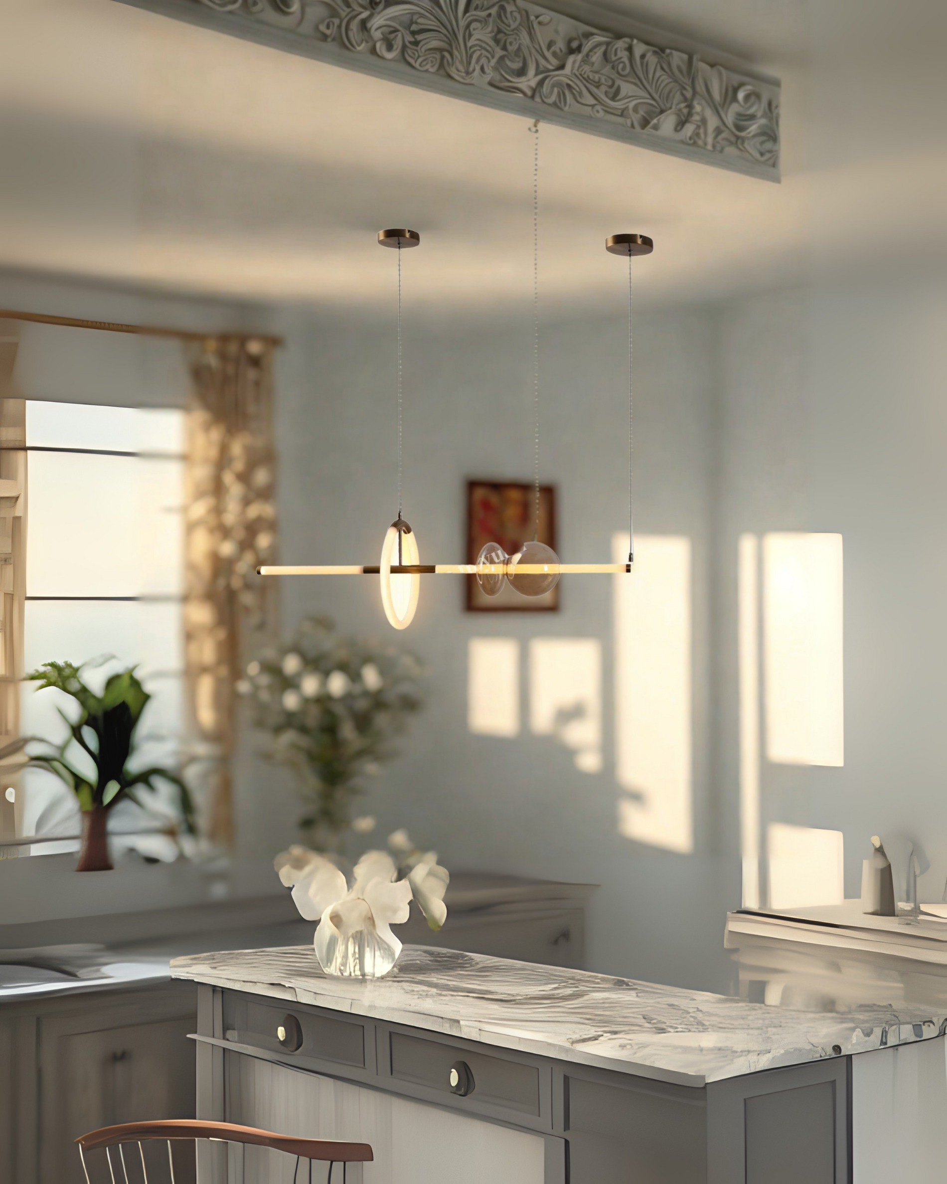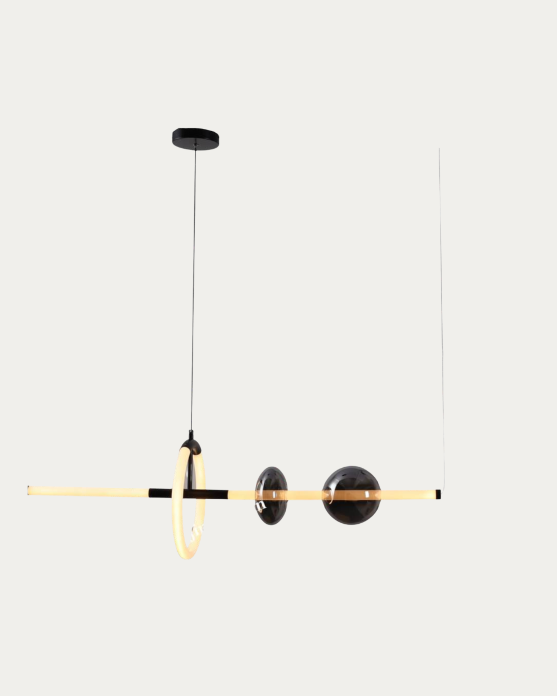 Lámpara colgante negra con diseño moderno, fabricada en vidrio y herraje de alta calidad. Potencia de 39W con fuente de luz LED integrada, ideal para comedor, sala o espacios amplios. Medidas: 100cm x (30cm x 15cm). Un toque de elegancia y modernidad para tu hogar u oficina.