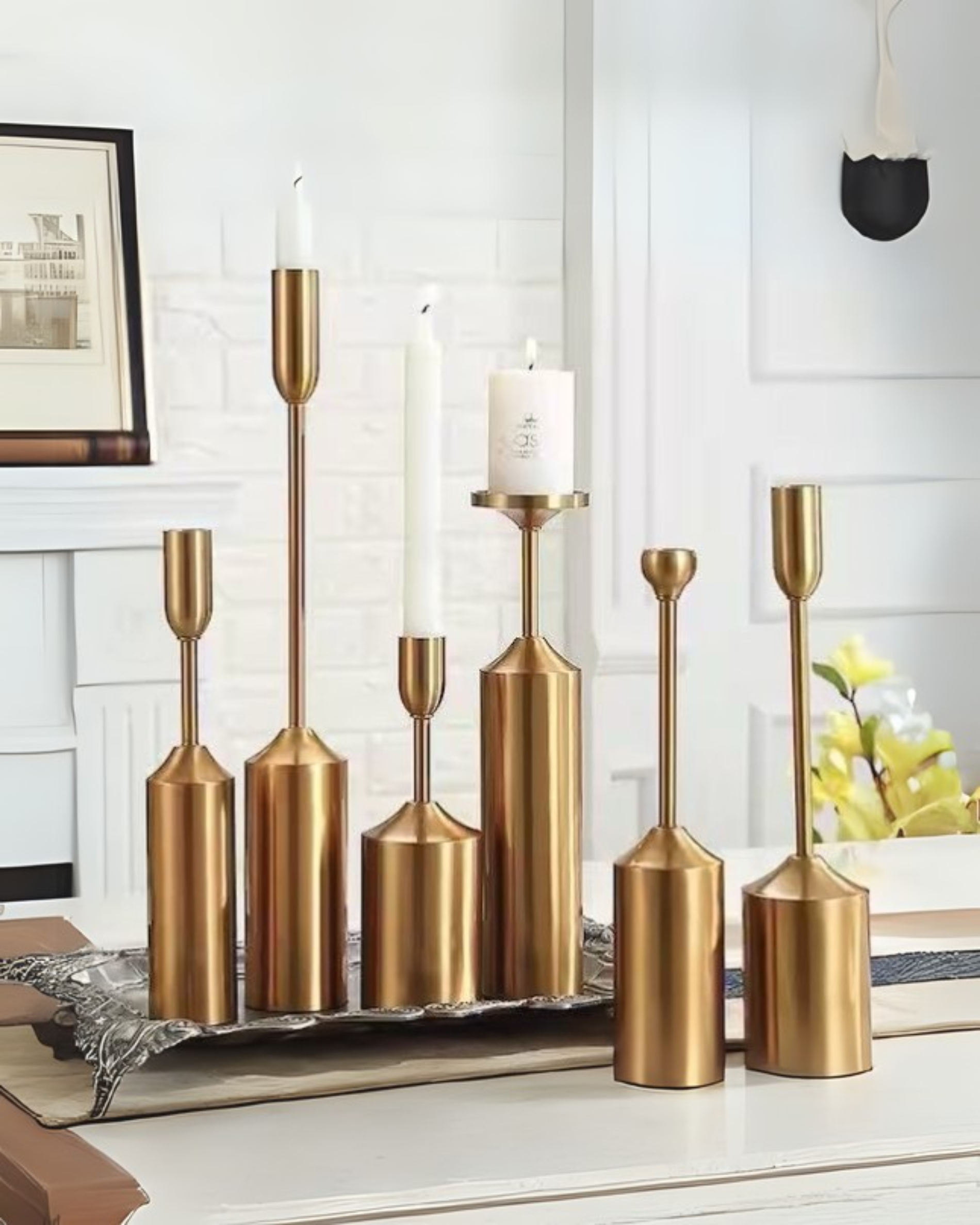 Elementos: Conjunto de seis candelabros de diferentes alturas. Cada candelabro tiene una base cilíndrica sólida. Algunos cuentan con soportes para velas delgadas, mientras que otros tienen bases más anchas.